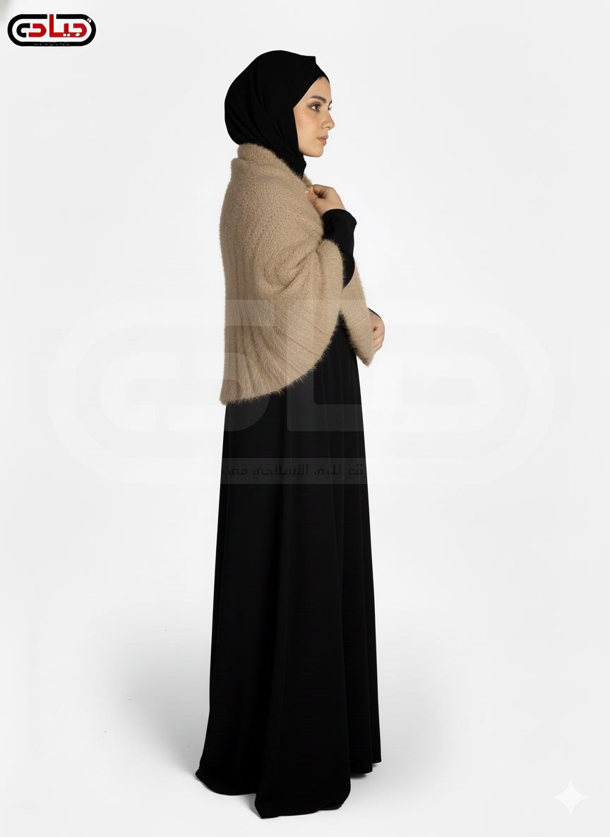 كاب فضفاض بكسر أمامية واستك داخلي تلبيس مزدوج علي الرأس أو الكتف من قماش الكريب السعودي داكن السواد