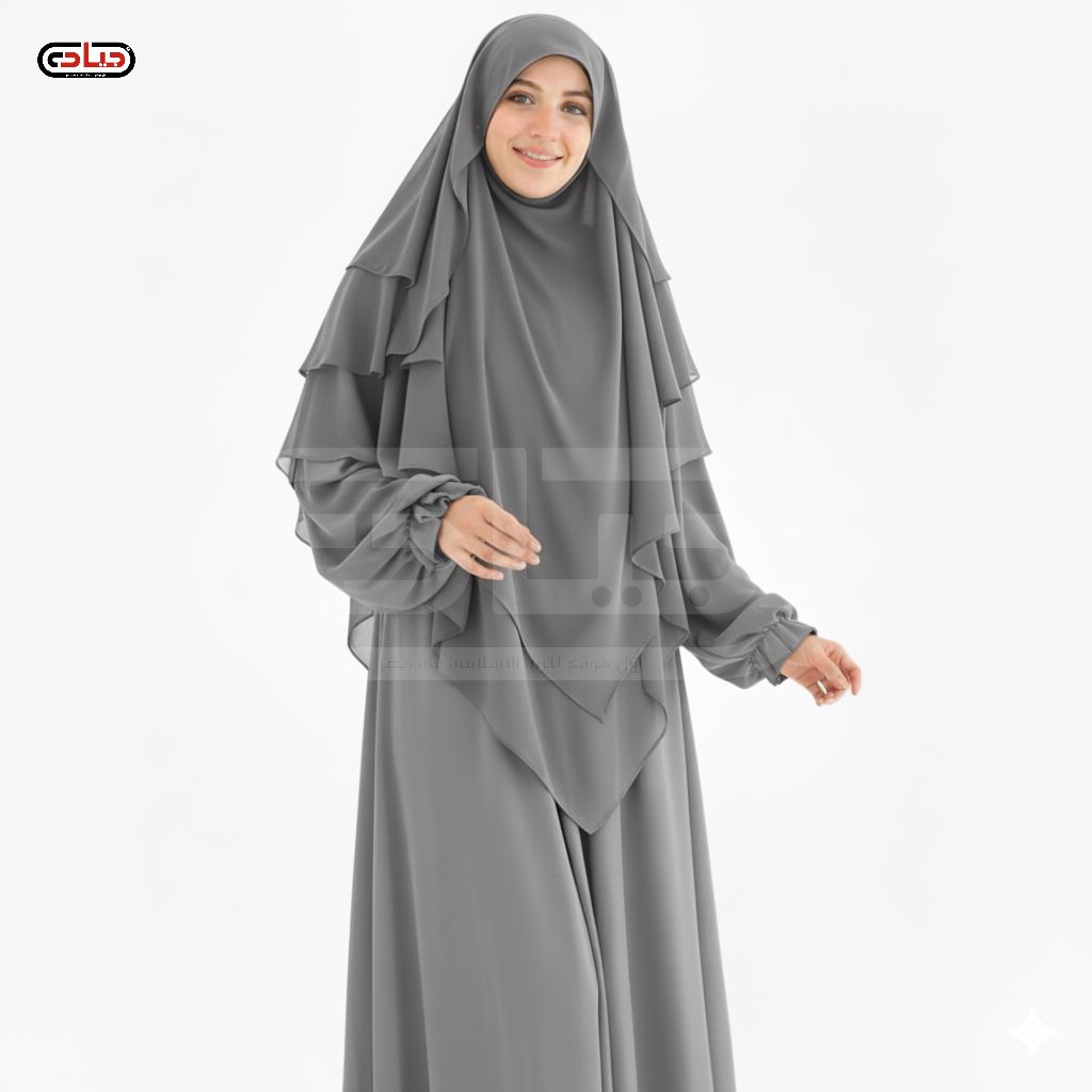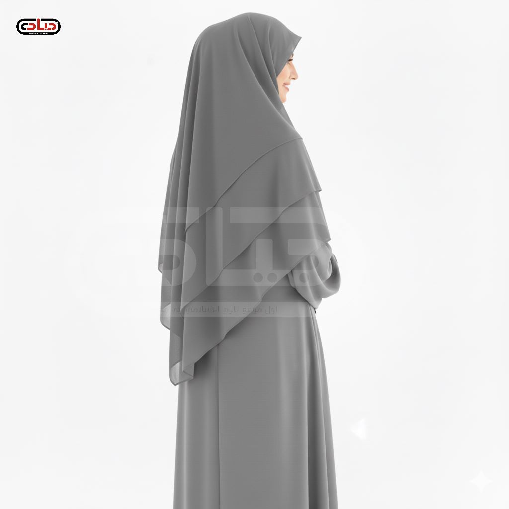 طقم محجبات موديل فرنسي مكون من عباية فضفاضة بحزام خصر وسوار استك ، خمار مثلث برباط داخلي ، نقاب استك بحجم قياسي xxl ،ماتريال رويال ناعم