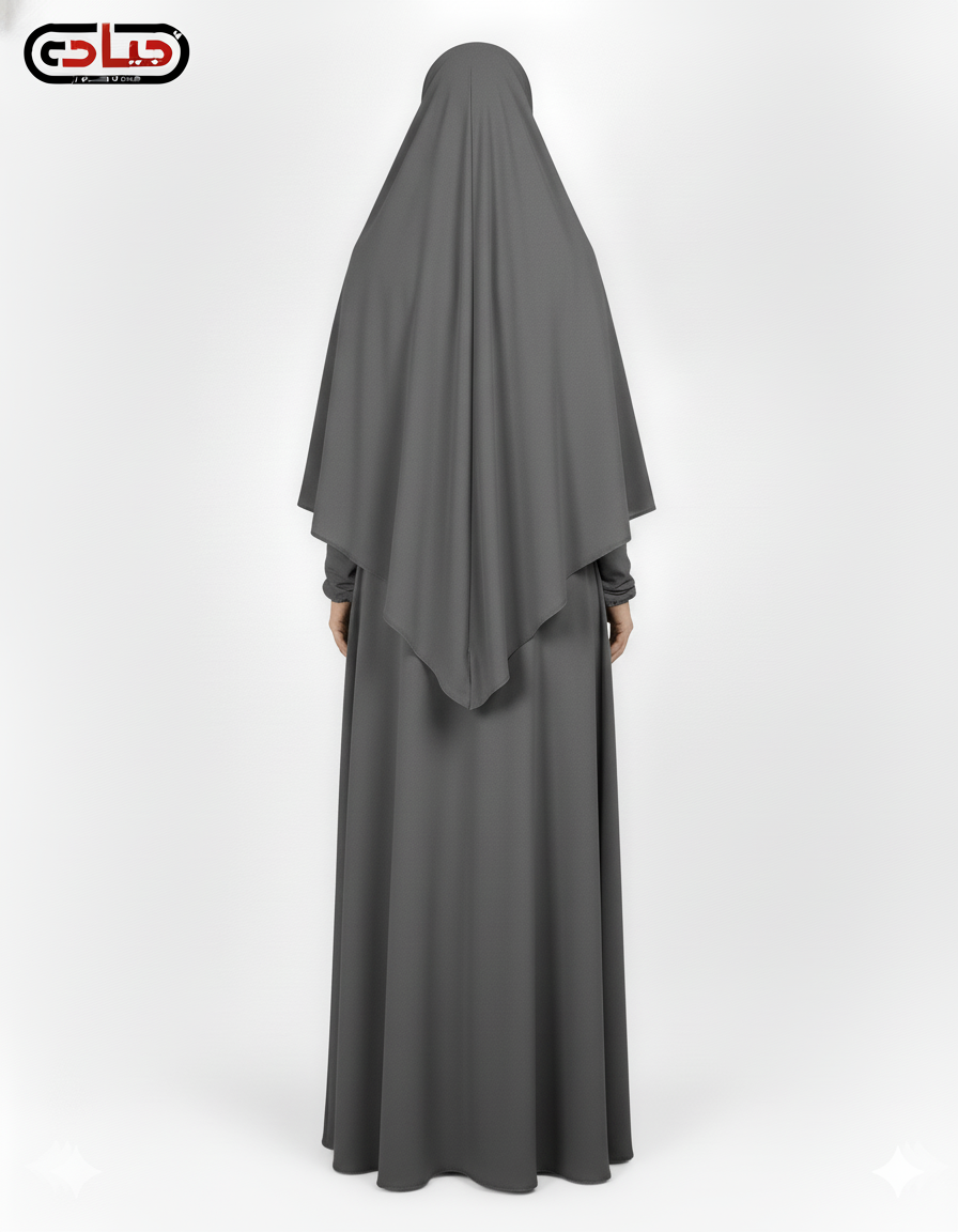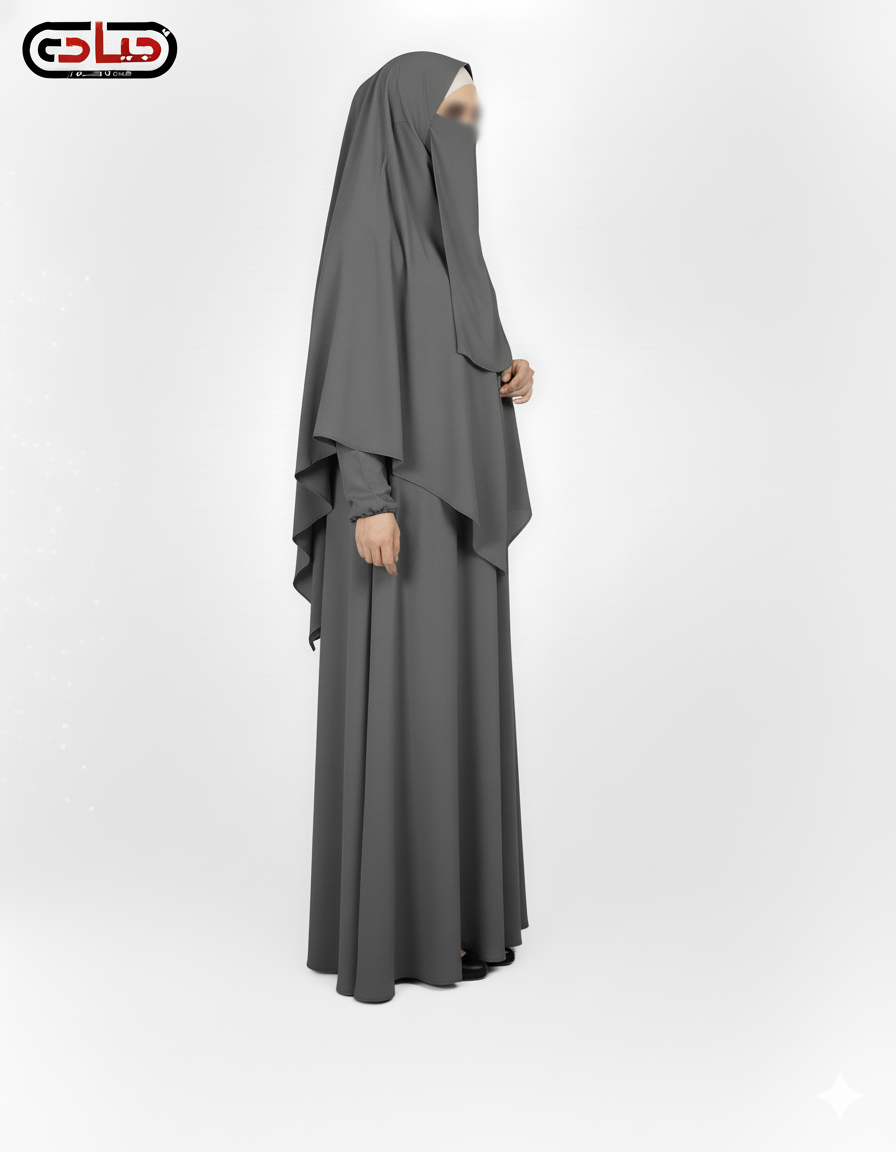 طقم محجبات موديل فرنسي مكون من عباية فضفاضة بحزام خصر وسوار استك ، خمار مثلث برباط داخلي ، نقاب استك بحجم قياسي xxl ،ماتريال رويال ناعم