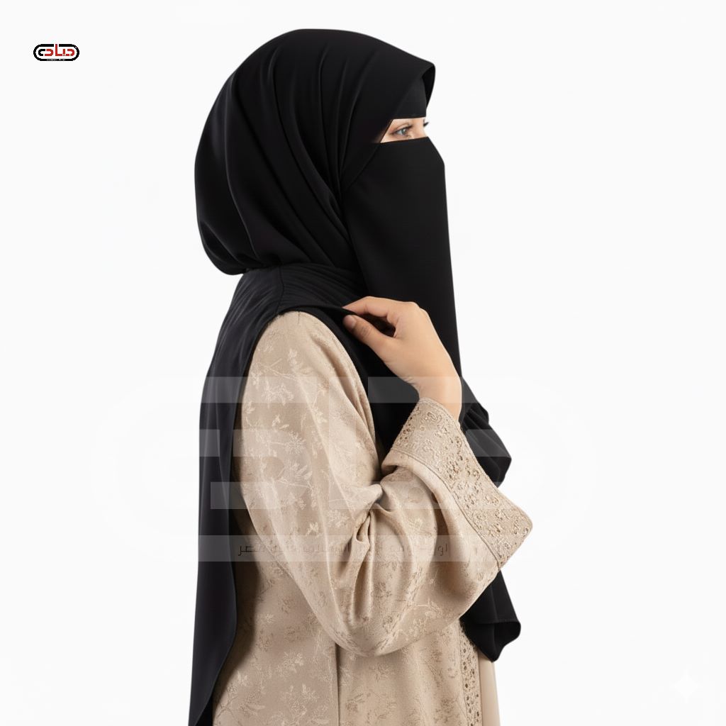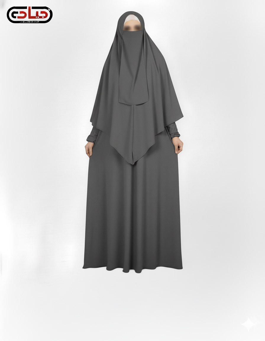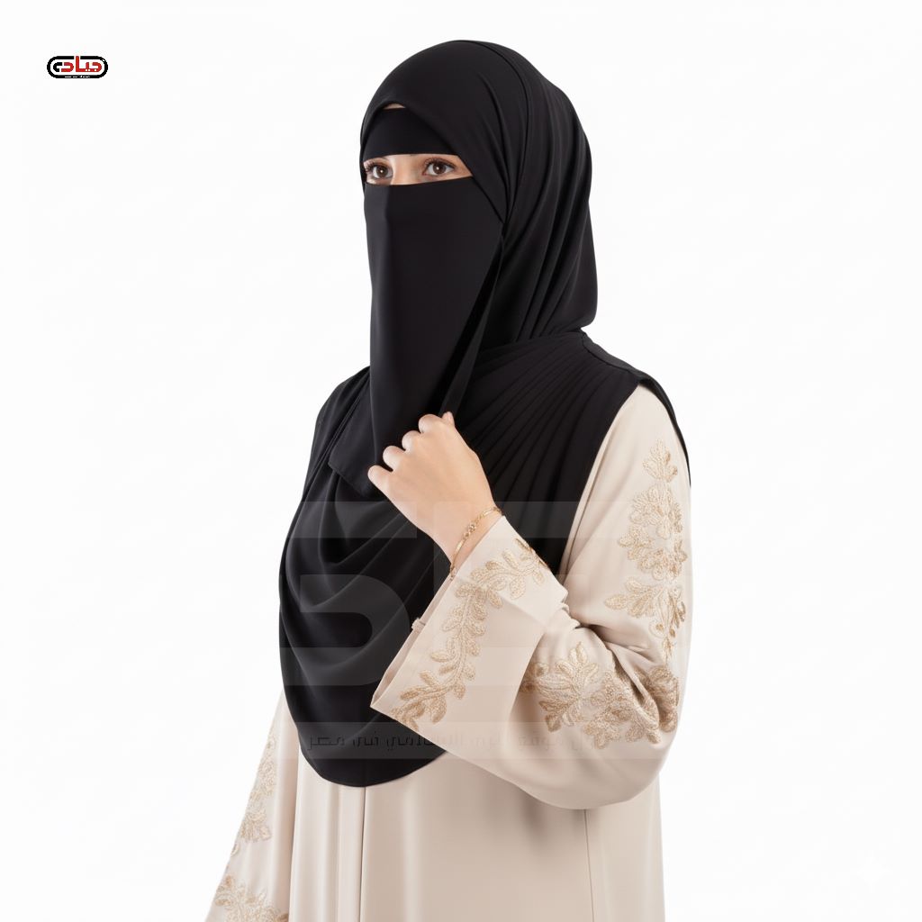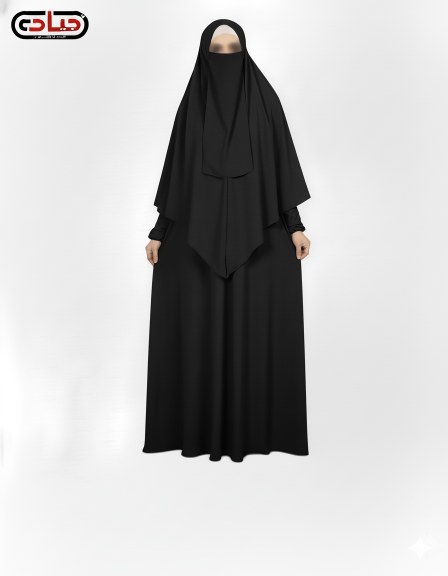 طقم محجبات موديل فرنسي مكون من عباية فضفاضة بحزام خصر وسوار استك ، خمار مثلث برباط داخلي ، نقاب استك بحجم قياسي xxl ،ماتريال رويال ناعم