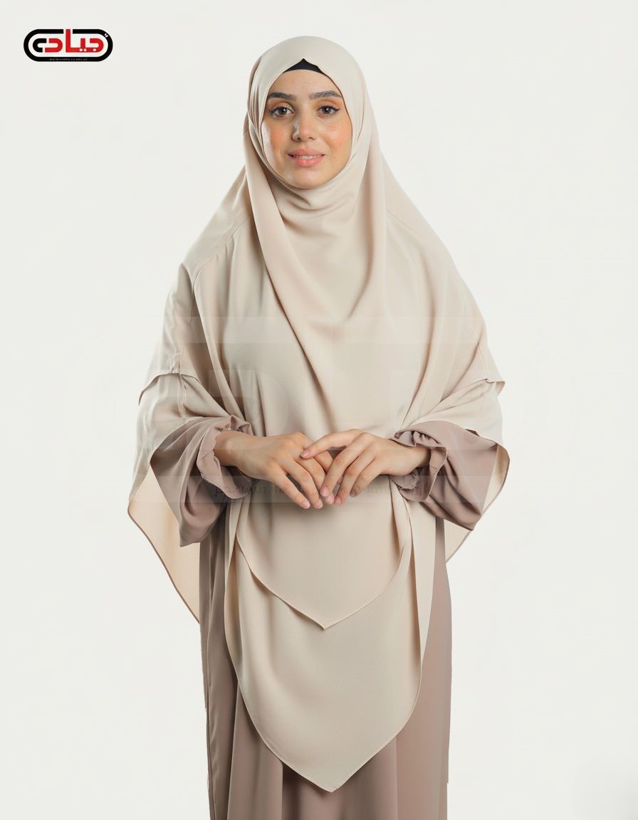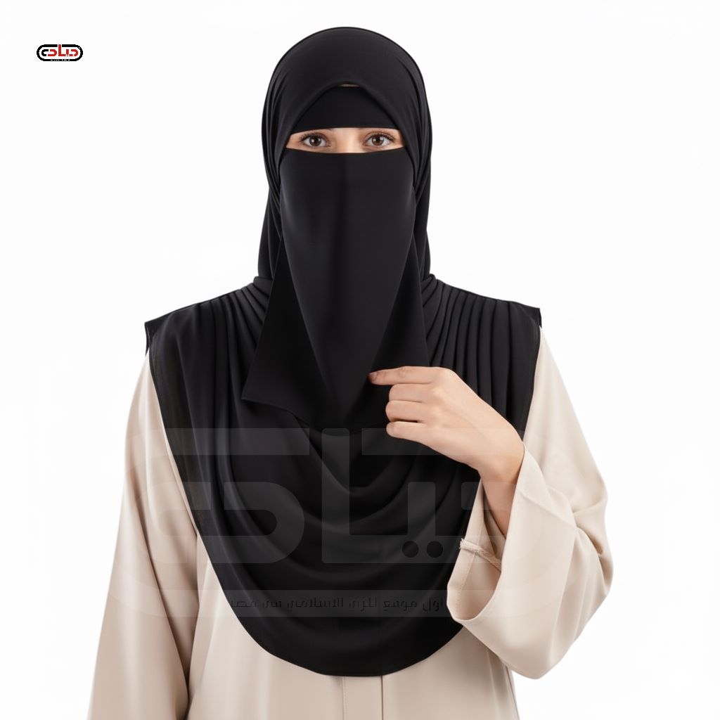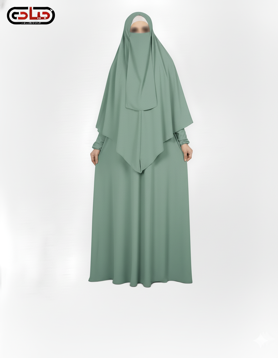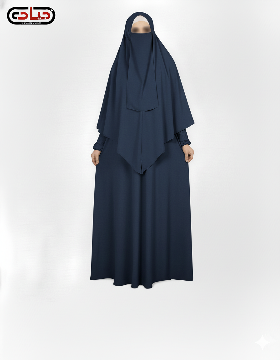 طقم محجبات موديل فرنسي مكون من عباية فضفاضة بحزام خصر وسوار استك ، خمار مثلث برباط داخلي ، نقاب استك بحجم قياسي xxl ،ماتريال رويال ناعم