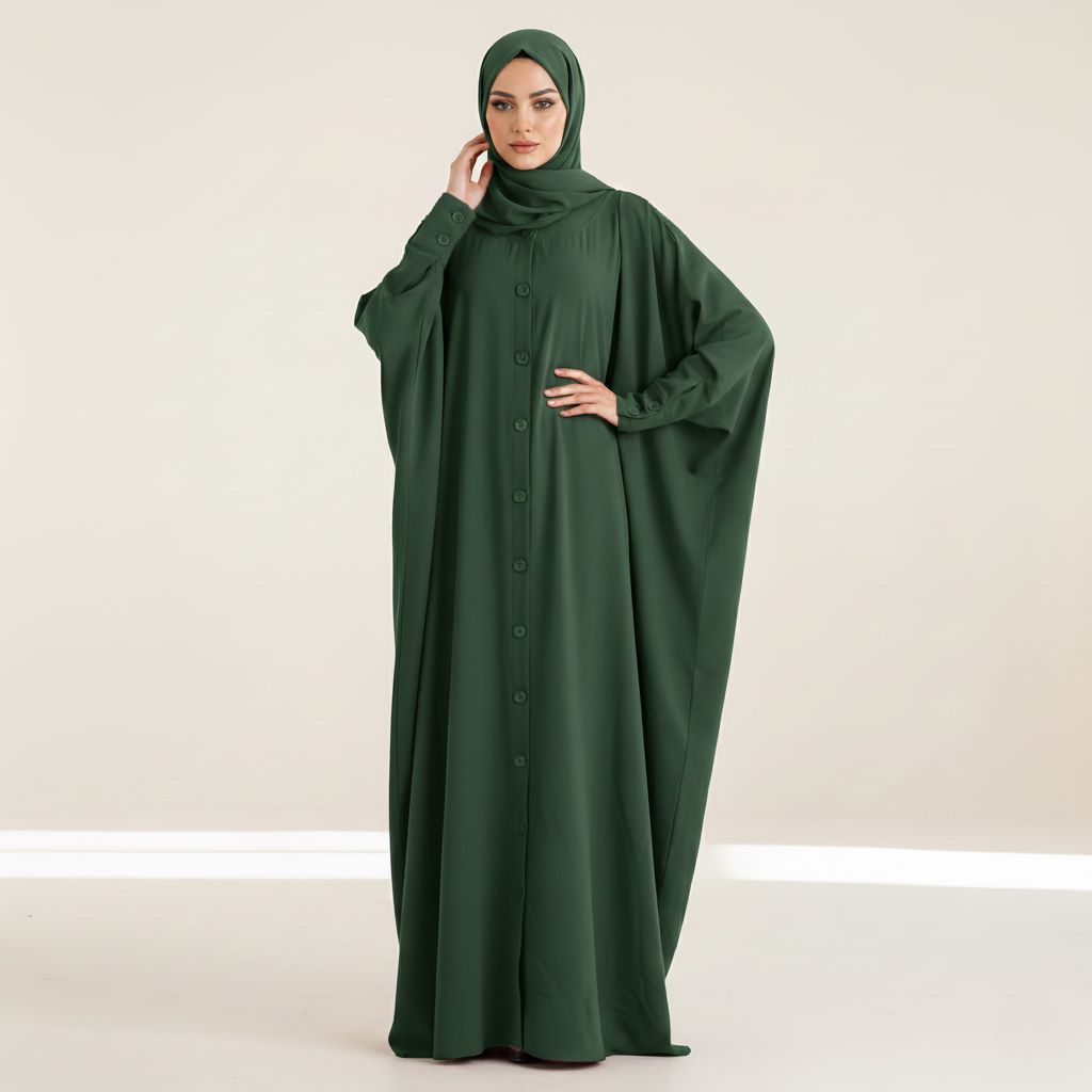 ملحفة فضفاضة من الحرير الناعم تلبيس علي الكتف بسحّاب امامي صغير وكم فراشة بكبسولة حجم فضفاض يناسب الأحجام الكبيرة