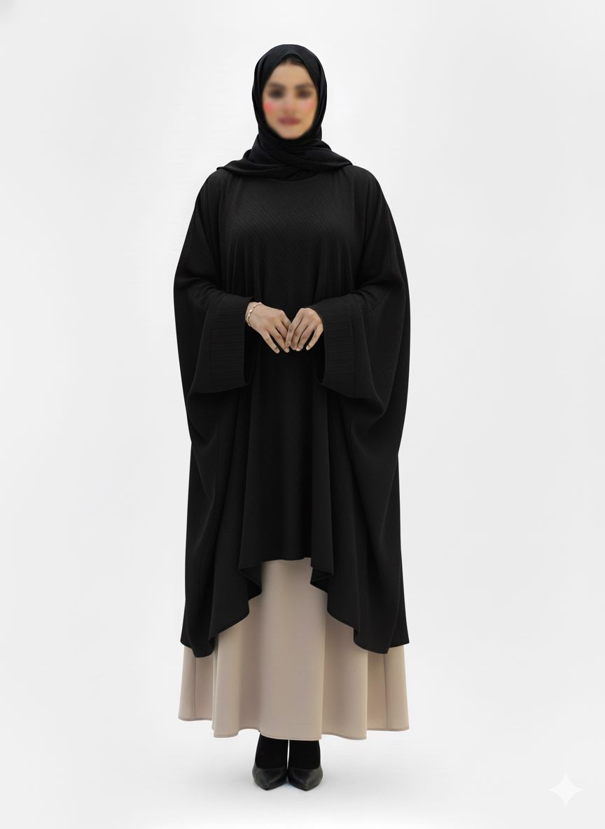 كاب فضفاض بكسر أمامية واستك داخلي تلبيس مزدوج علي الرأس أو الكتف من قماش الكريب السعودي داكن السواد