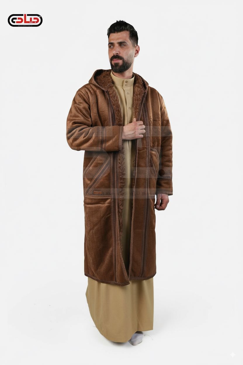 فروة رجالي مخمل موديل بالطو طويل ببطانة داخلية كثيفة وغطاء للرأس مزودة بجيوب شق وزن تقيل