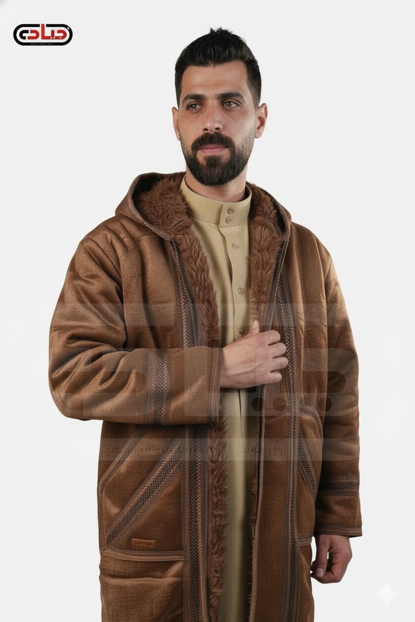 فروة رجالي شتوي من المخمل ببطانة كثيفة من الفراء الصناعي مزينة بأشرطة خارجية بطول متوسط بغطاء للرأس وبدون منتج سوري عالي الجودة وزن 1900 جرام