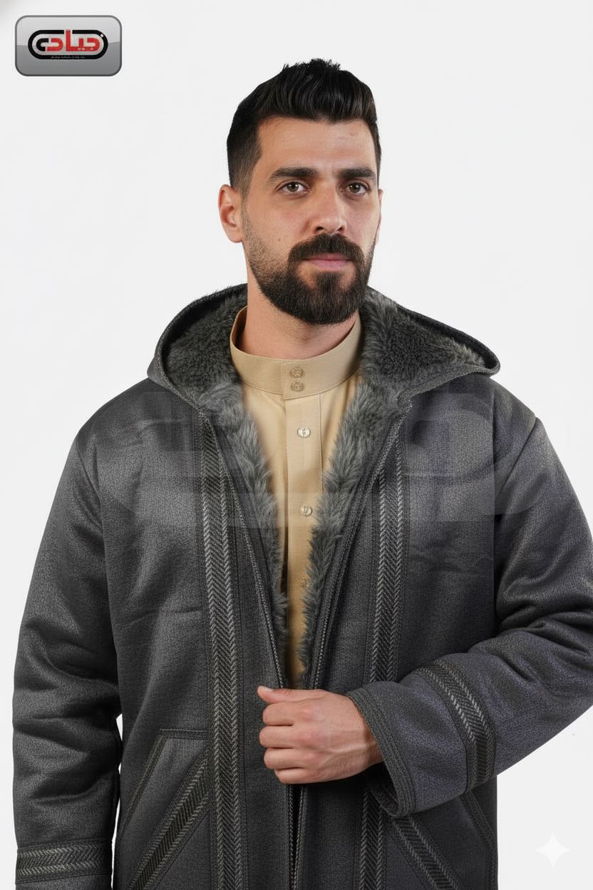 فروة رجالي شتوي من المخمل ببطانة كثيفة من الفراء الصناعي مزينة بأشرطة خارجية بطول متوسط بغطاء للرأس وبدون منتج سوري عالي الجودة وزن 1900 جرام