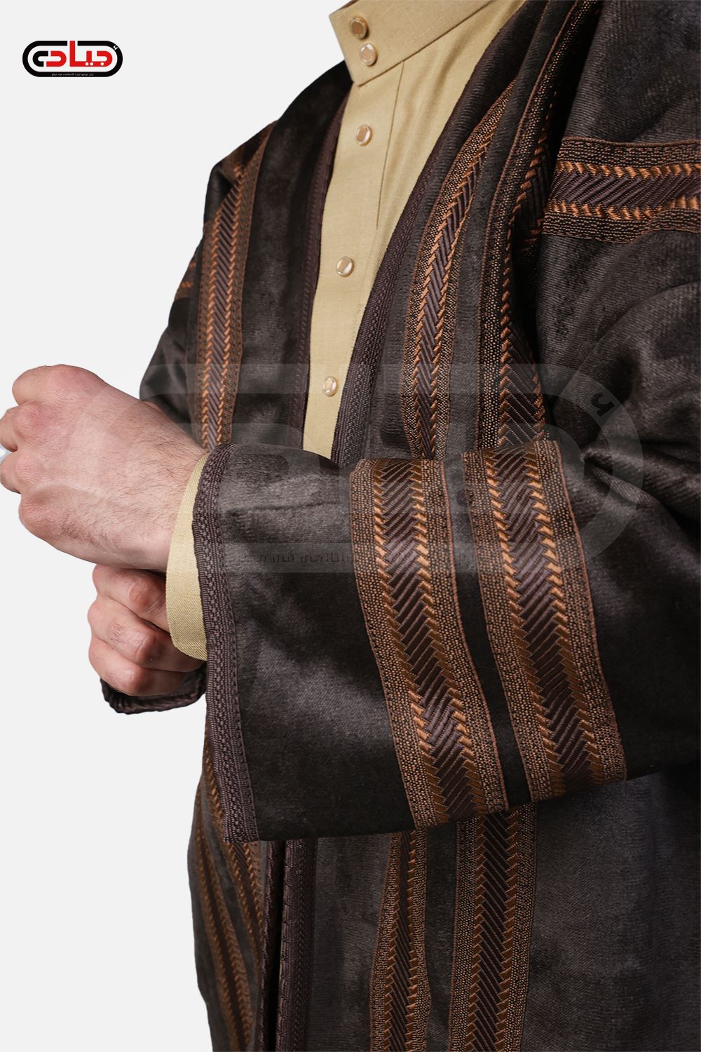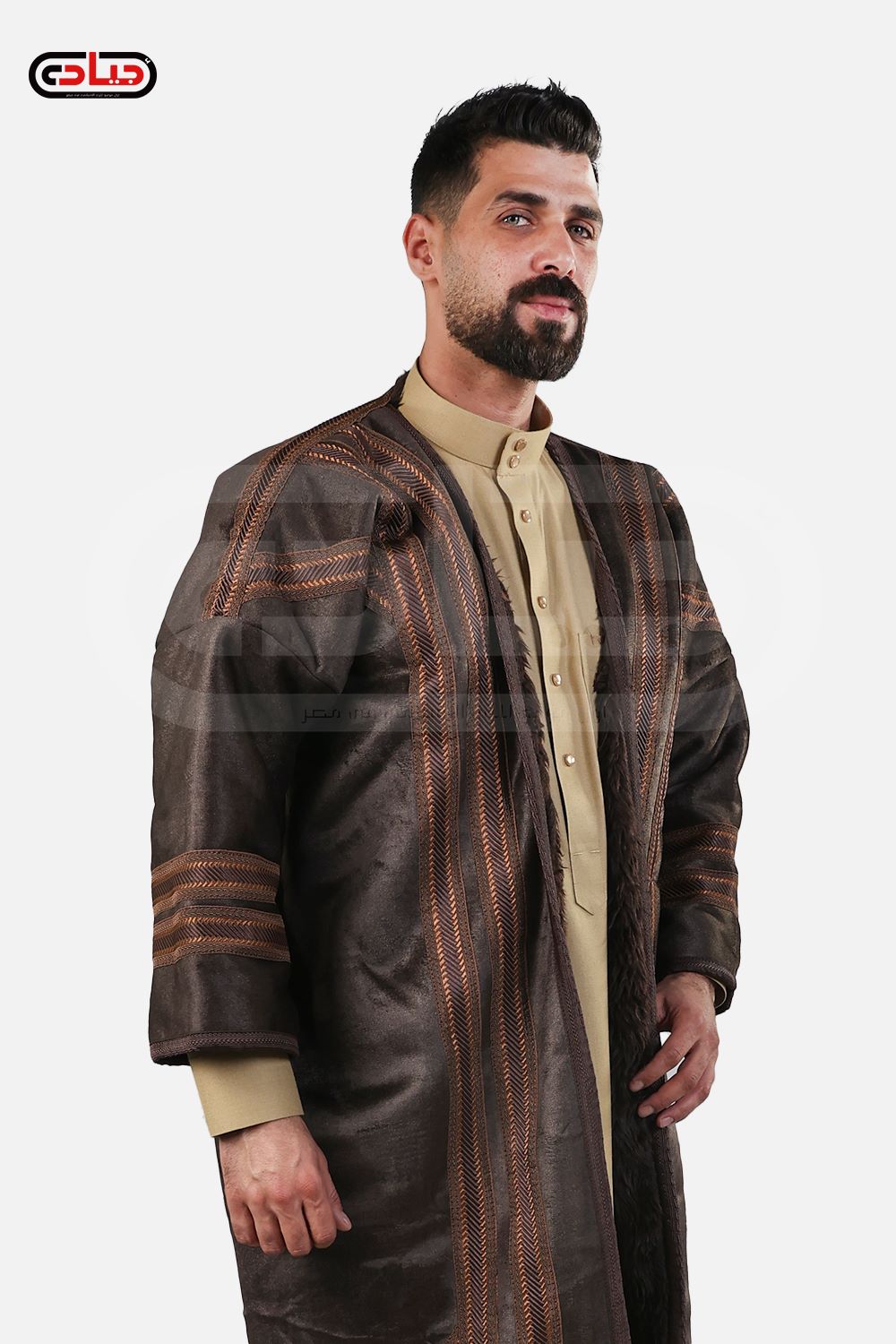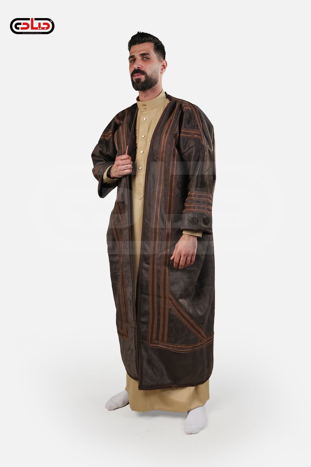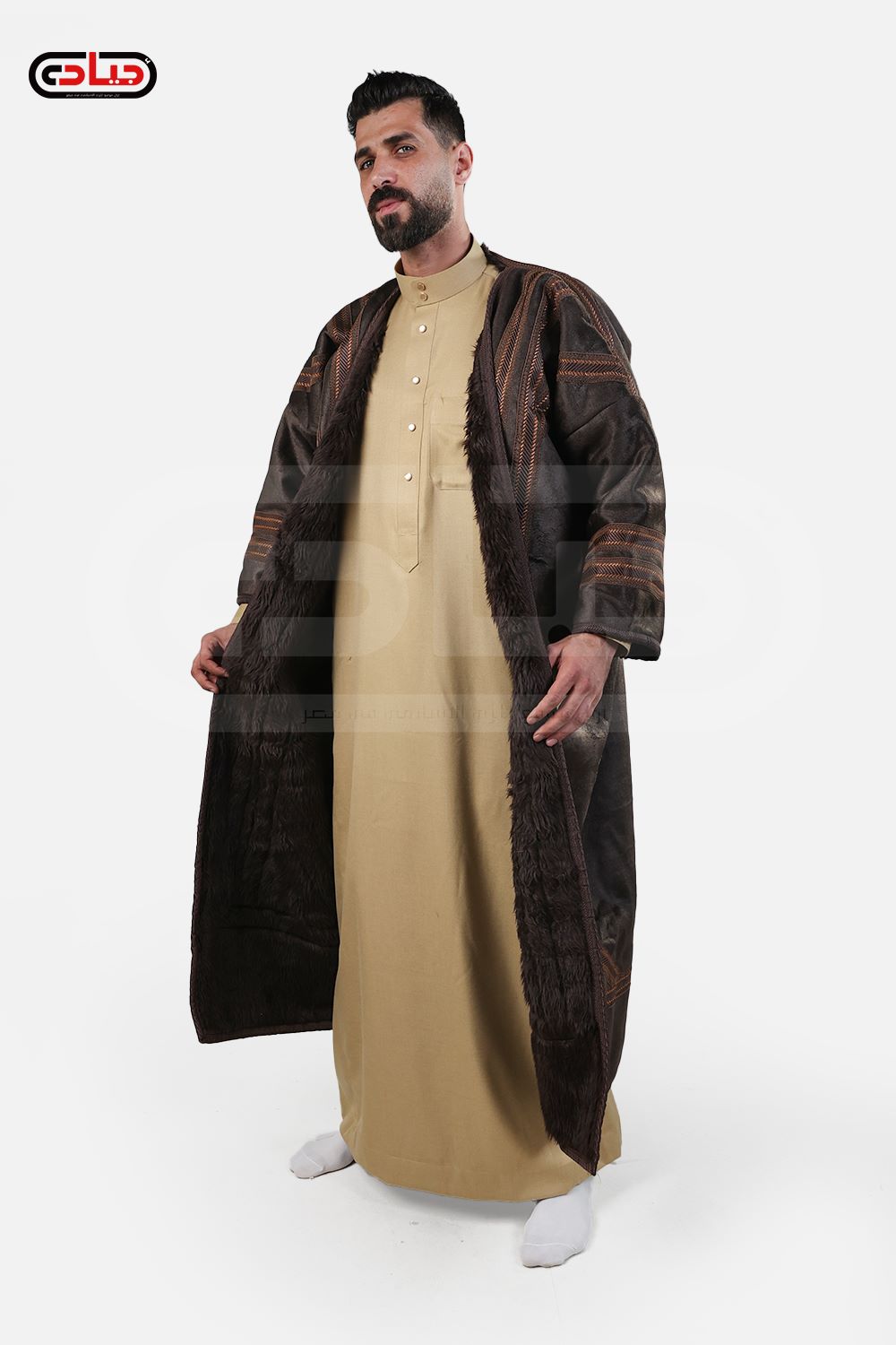 فروة رجالي شتوي من المخمل ببطانة كثيفة من الفراء الصناعي مزينة بأشرطة خارجية بطول متوسط بغطاء للرأس وبدون منتج سوري عالي الجودة وزن 1900 جرام