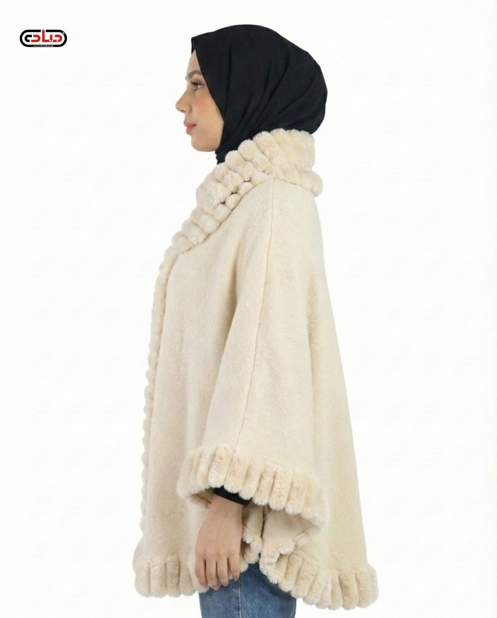 كاب نسائي شتوي مقفول بأزرار أمامية من الصوف الناعم مطعّم بفراء خارجي وجيوب شق