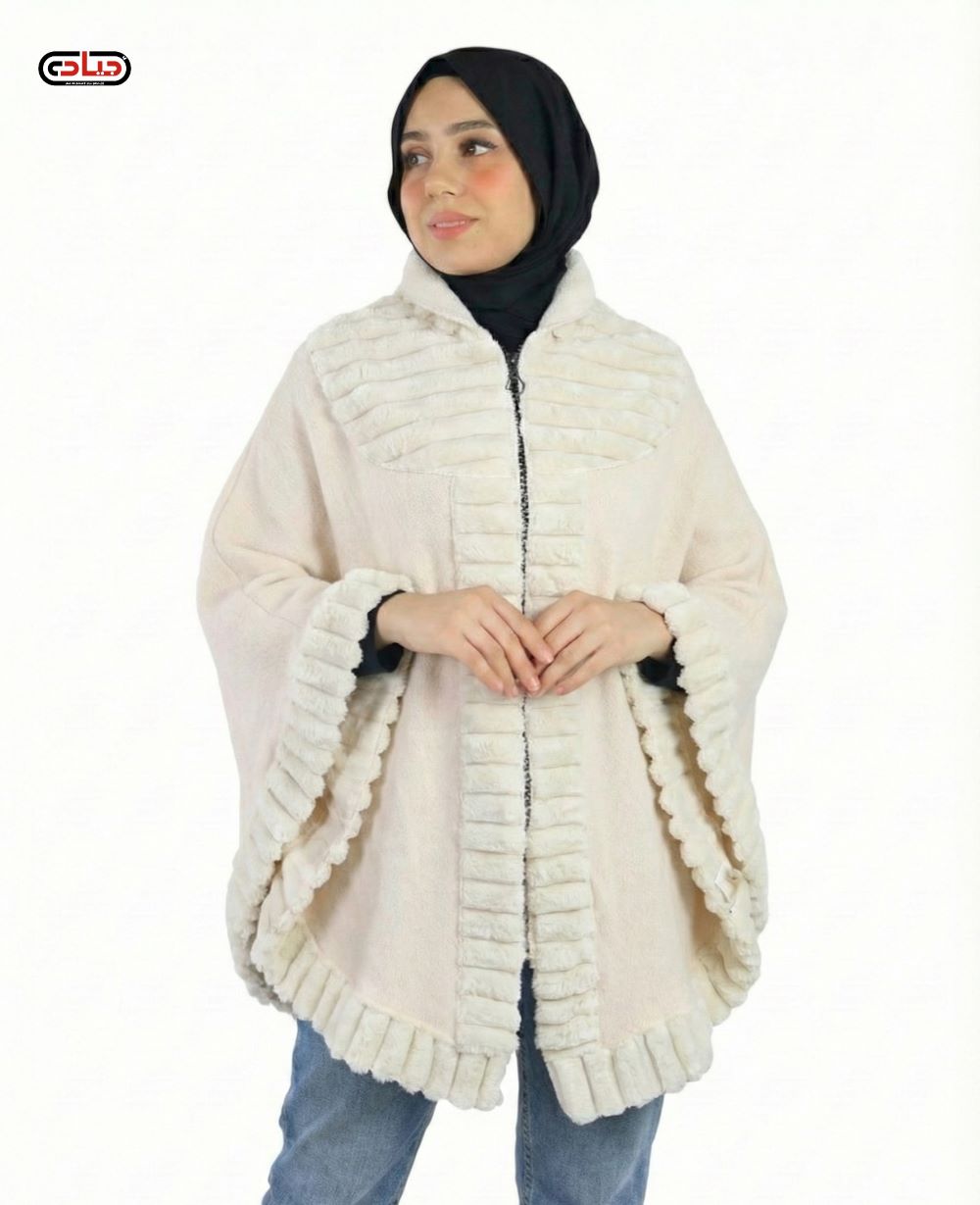 بونشو نسائي مفتوح بسحّاب أمامي من الصوف الناعم مطعّم بفرو خارجي