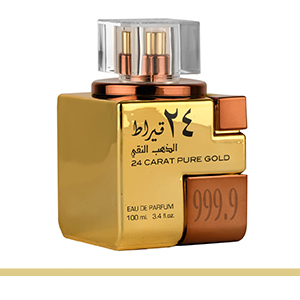 يتكون عطر 24 قيراط الذهب النقي من مزيج شرقي خشبي فاخر، حيث يفتتح العطر بمكونات عليا من العود والزعفران والقرفة، ثم ينتقل إلى قلب العطر الذي يحتوي على الورد وخشب الصندل، وأخيراً يستقر على قاعدة من الجلد والبخور والعنبر والمسك والفانيليا. مكونات عطر 24 قيراط الذهب النقي بالتفصيل: مكونات عليا: العود، الزعفران، القرفة. مكونات وسطى: الورد، خشب الصندل. مكونات قاعدة: الجلد، البخور، العنبر، المسك، الفانيليا. يتميز العطر بتركيبة غنية ومترفة تجمع بين الدفء الشرقي والحسية الخشبية.