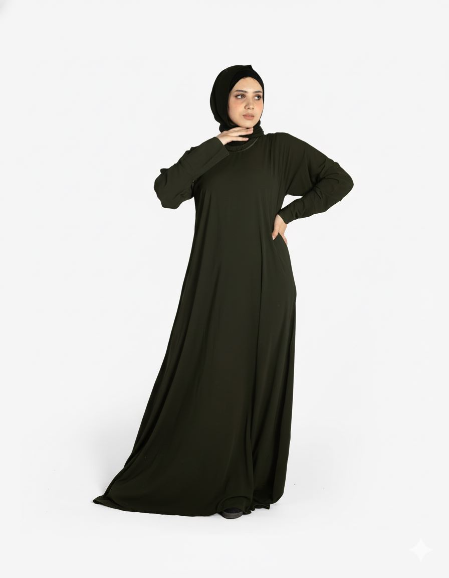 عباية سادة كلوش بنهاية واسعة برقبة مستديرة نصف ياقة مزودة بكبسولة وسحّاب صغير حجم m ، L