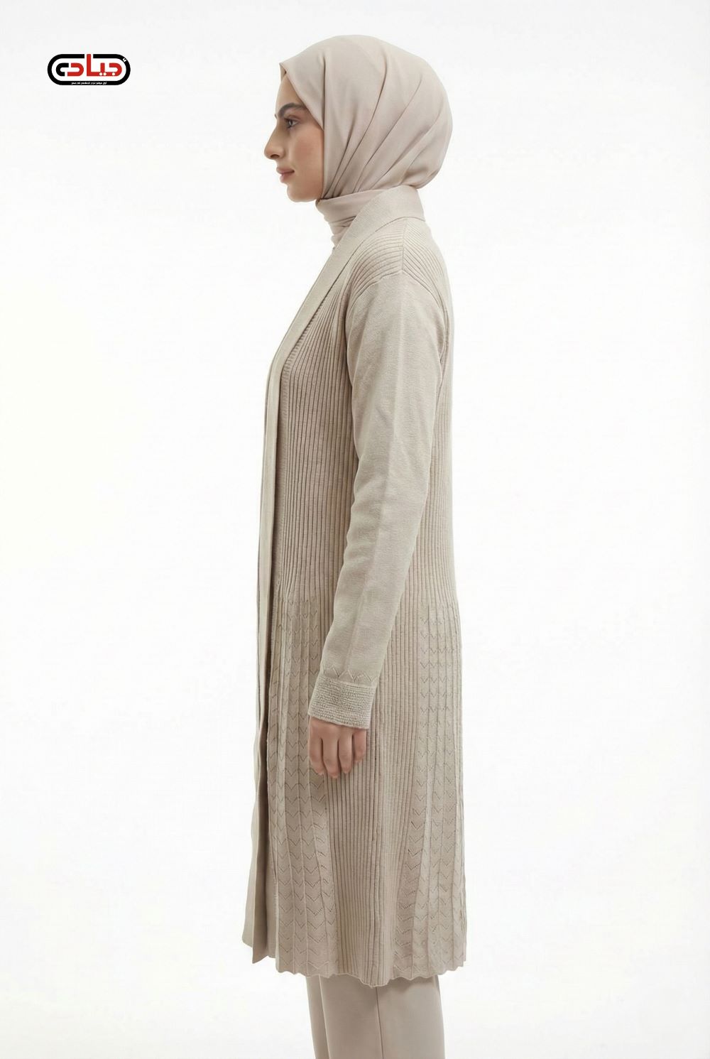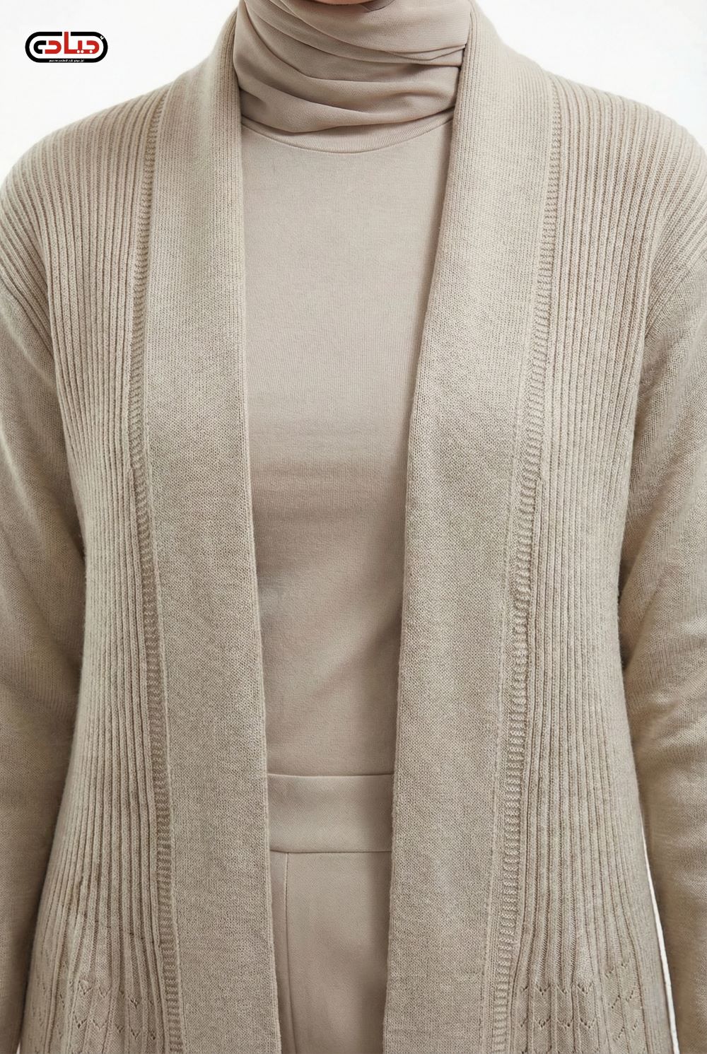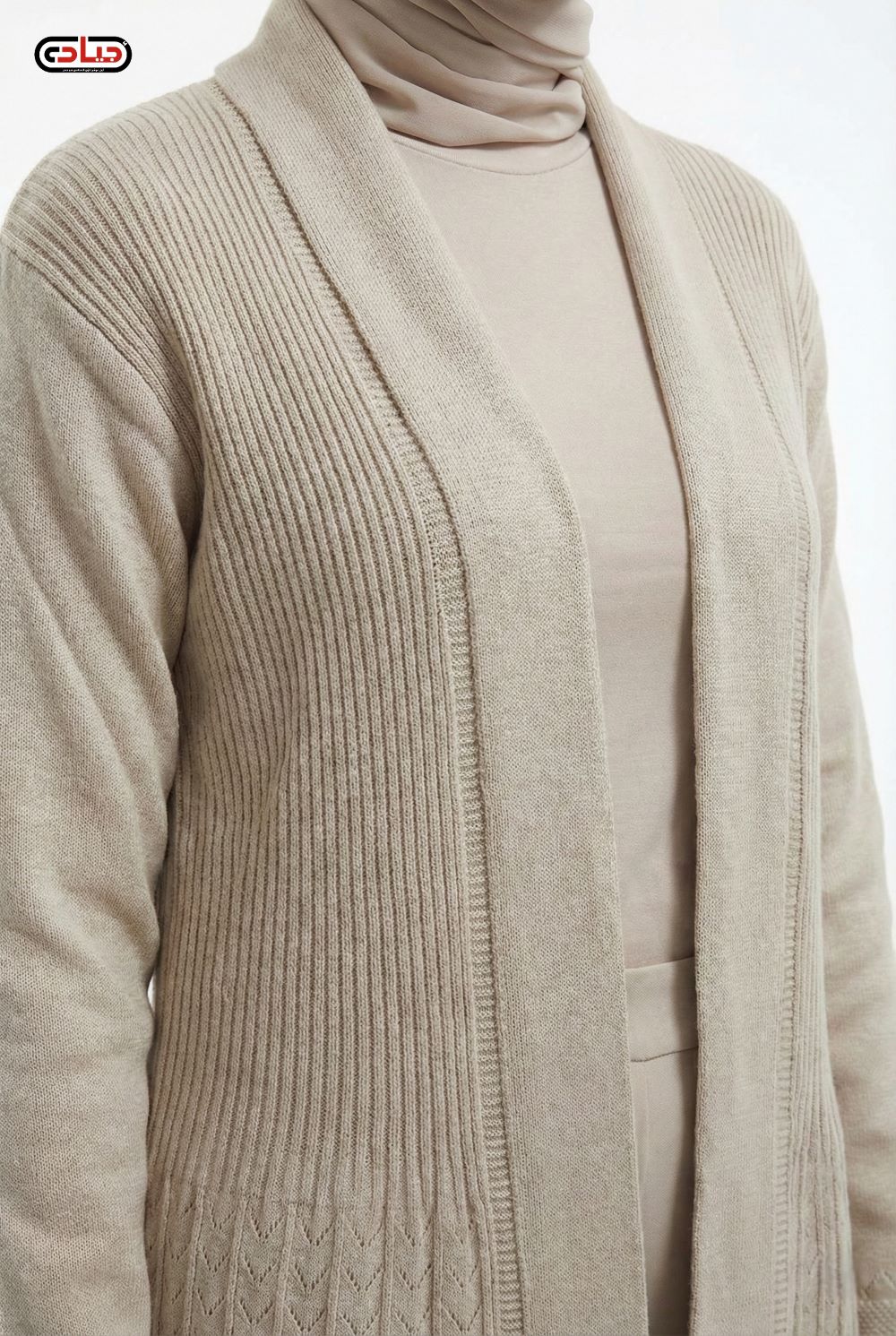 هذا الكارديجان الصوفي الطويل بتصميمه المحبوك الأنيق يجمع بين الراحة والأناقة العصرية. تفاصيل الحياكة المعقدة التي تضفي عمقاً وملمساً فريداً على القطعة. التصميم بفتحة أمامية مفتوحة يمنحك حرية التنسيق والارتداء بسهولة، مما يجعله مثالياً للإطلالات اليومية والمناسبات غير الرسمية. يتميز الكارديجان بطوله المناسب الذي يوفر تغطية أنيقة، بينما تضيف التفاصيل المحبوكة على الجوانب والأكمام الطويلة لمسة من الرقي والتميز. هذه القطعة متعددة الاستخدامات يمكن تنسيقها مع مختلف الإطلالات، سواء مع البنطلونات الكلاسيكية أو التنانير، لتمنحك مظهراً عصرياً ومريحاً في آن واحد. مثالي للأجواء الباردة والمعتدلة، هذا الكارديجان سيكون إضافة رائعة لخزانة ملابسك. يُنصح بالعناية الخاصة عند الغسيل للحفاظ على جودة النسيج وجمال التصميم.